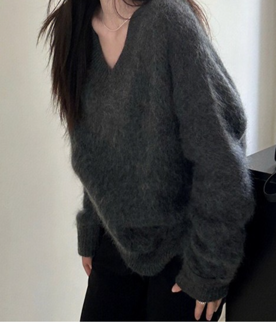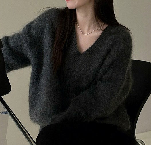 Mira Fluffy Knitted V-neck Jumper (DARK GREY)